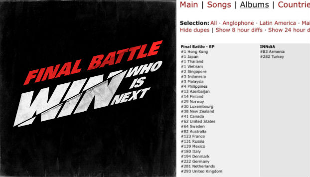 “FINAL BATTLE”, a single album of Team A and B of “WHO IS NEXT:WIN” (WIN) which is YG Entertainment (YG)’s project for debut of its new boy band, has topped iTunes album charts in four countries.