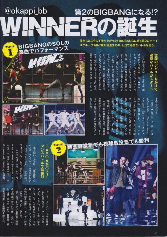 On the 23rd of August, MNET released the reality TV show,”WHO IS NEXT ?” , and this was planned by YG. To be able to choose the group that’ll be the next BIGBANG, the competition was divided into 3 battles. On the first battle’s mission,BIGBANG’s Taeyang and G-Dragon was picked as the guidance for both teams who will perform their solo songs. Team Awas guided by Taeyang and performed these two songs ” Only ” and ” Wedding “. While G-dragon was the guidance for Team B, they performed his ” michigo ” and ” Crayon ” . Both teams were very nervous as it was their first time on the stage. But they learned a lot from the BIGBANG seniors so at the end, they did their best for the first battle. For the first battle’s voting by the judges, Team B took the victory. But, Team A won for audience’s voting and they were one step closer to debuting.