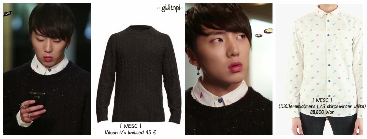 EPISODE 8: Now, let’s move to another main character of The Heirs Parody by Winner, He is Kang Seungyoon aka Yang Tan. This is his scene when first meeting Nam Eunsang in YG Building. The shirt that he wore was Jeremia Shirt from WESC which costs 88,800 Won and the sweater that he wore was Vilso Knit Black Sweater which costs or 106,800 Won .