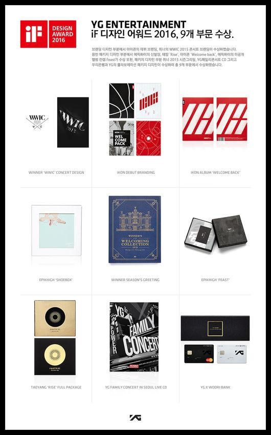YG Design Lab won nine iF awards for EPIK HIGH “SHOEBOX” album package design, EPIK HIGH “FEAST” album package design, TAEYANG 2ND ALBUM “RISE” album package design, iKON “WELCOME BACK” album package design, iKON DEBUT branding design, WINNER WWIC 2015 CONCERT branding design, YG FAMILY CONCERT LIVE CD package design, WINNER SEASON’S GREETING DVD package design, and YG X WOORI BANK package design in the categories of album design, package design, and branding design.
