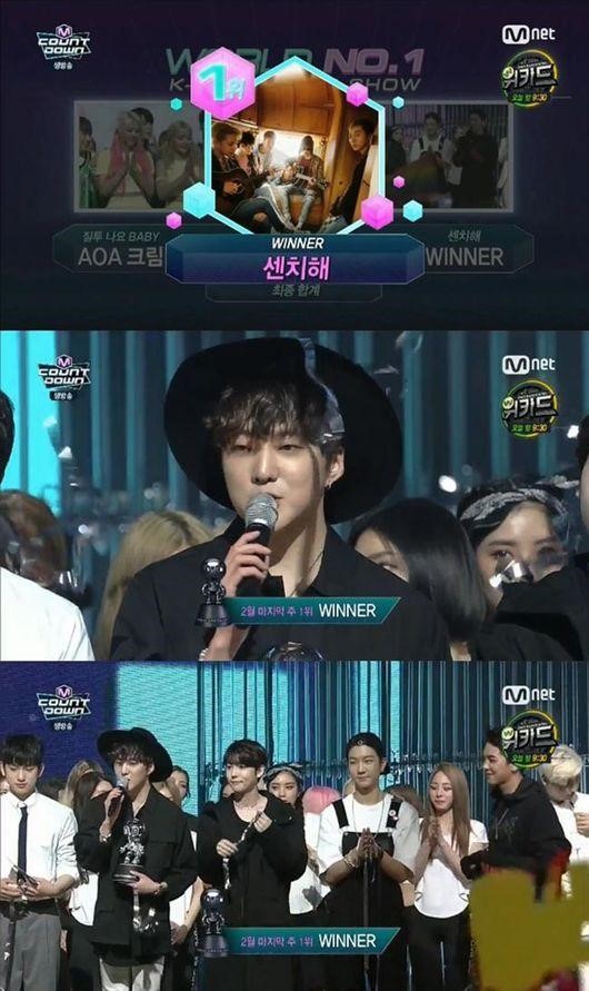 On February 25, WINNER received a trophy for taking the no.1 spot on Mnet’s M Countdown chart with “SENTIMENTAL”.