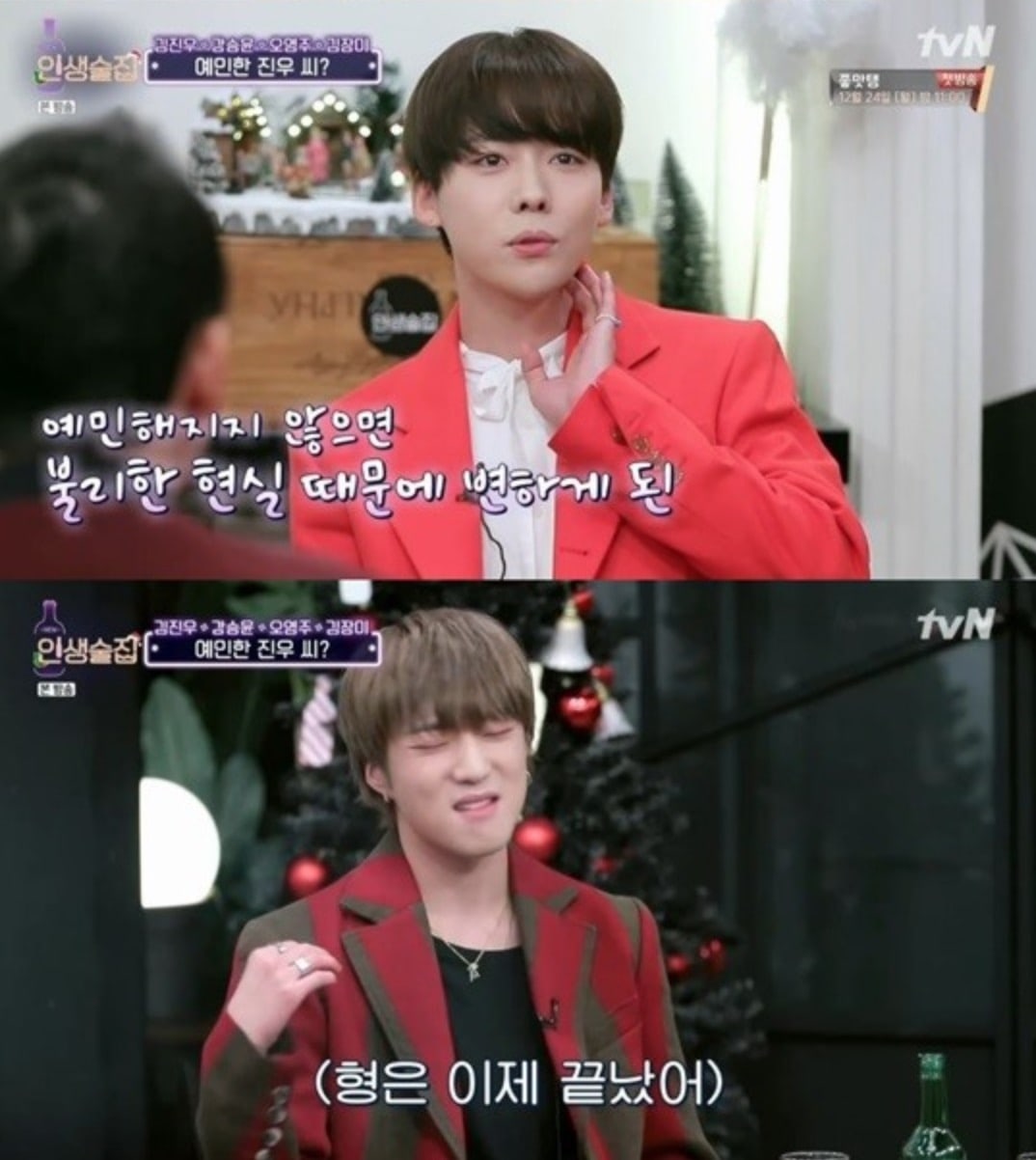 Jinwoo hyung has changed. Personality disqualified. Recently, his personality has become really sharp. One day, his stage outfit was so nice, so I complimented him. He just said, ‘Hey. Keep that kind of talk to yourself.’ Turns out he didn’t like the outfit.”