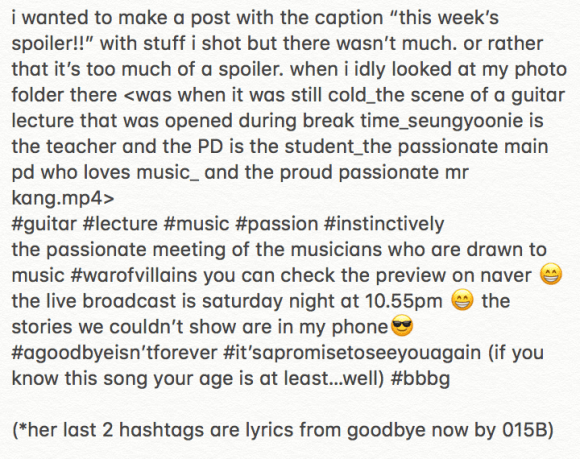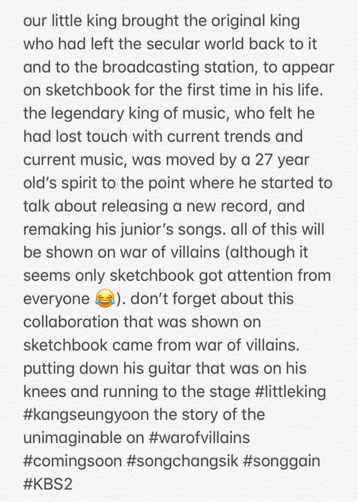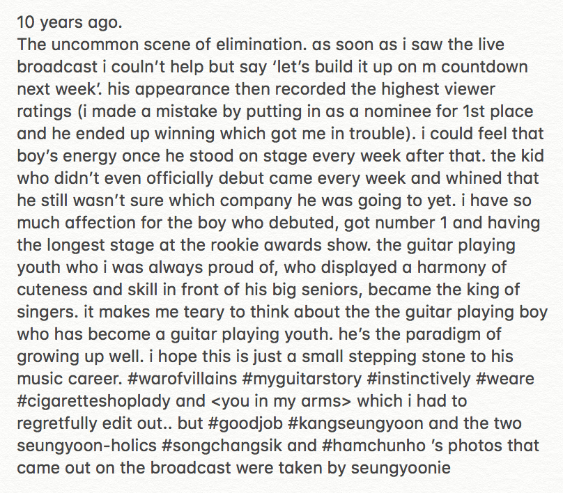 PD ‘dalzaka’ has shared lovely anecdotes and behind-the-scenes clips of Seungyoon’s guesting on War of the Villains on her Instagram account. It so happens that she has known Seungyoon as a kid since 10 years ago, from his Superstar K2 days. Her posts are sweet and so full of love and admiration for our Superstar ! Here are her posts and some translations from various sources.
