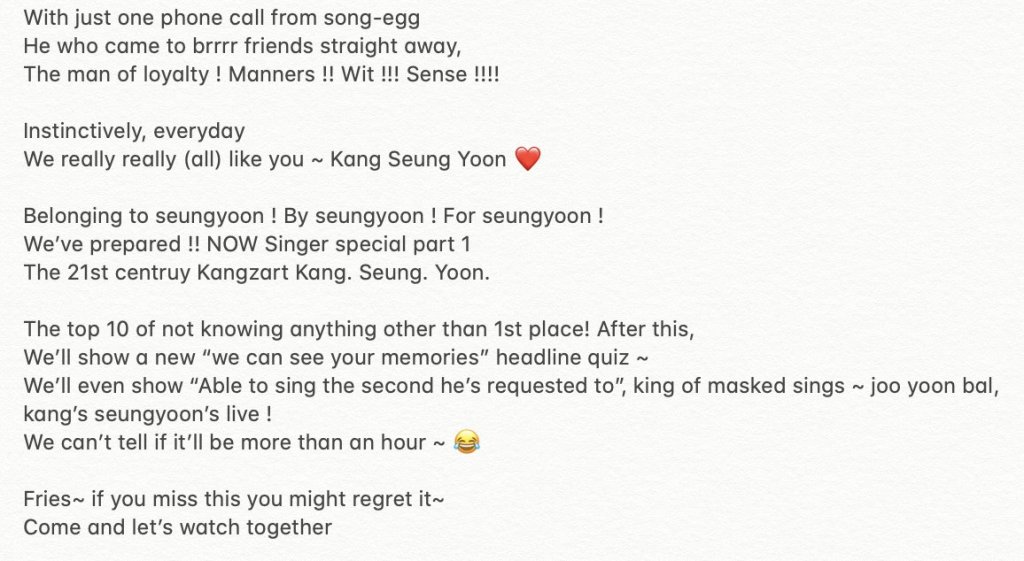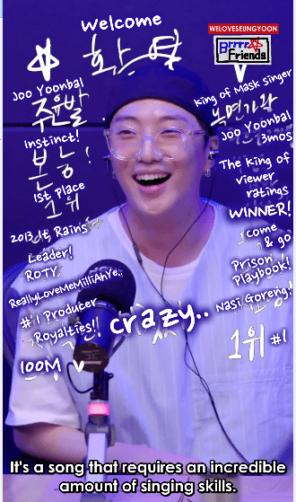 Kang Seungyoon was the guest for Episode 27 of Naver Now Brrrr Friends , a radio show hosted by Mino and Block B’s PO on September 16, 2020. Right after introducing Seungyoon’s many many many maaaany accolades from being the instinctively Superstar to being able to trend Nasi Goreng at #1 just by mentioning he was having it for lunch, he was asked to sing his favourite KOMS performance, Blue Whale… and wow! He blew us away yet again, this time an unmasked king!