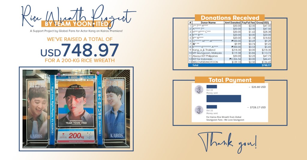 The donation drive from fans around the world to send Seungyoon and the Kairos team a rice wreath is a success! We’ve raised a total of USD 748.97 for the 200-kg Rice Wreath which will be donated in Seungyoon’s name to the people in need via the YG WITH Campaign. Check out the summary of donations and payment below.