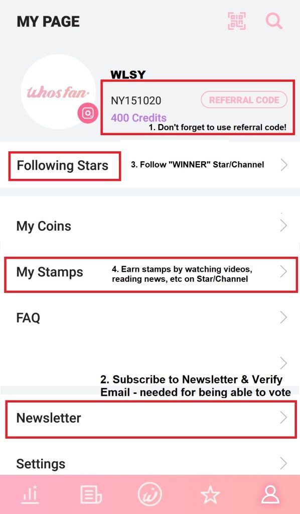 Earning credits on Whosfan via various daily activities help earn more credits during the voting periods. This daily extra credit is useful only for misc voting, but not for M!Countdown pre-voting. So it’s upto you to collect the credits!