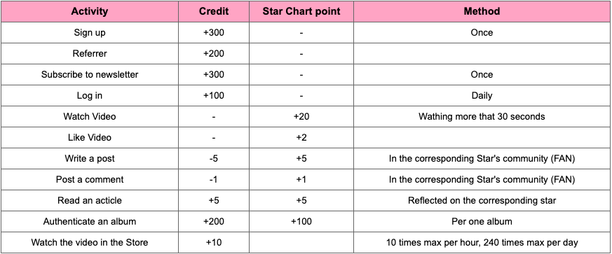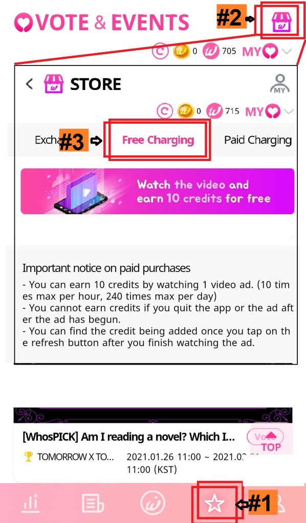 - Fasted way to earn credits is to just login everyday (100 credits). More credits can be earned by watching ads/posting/etc (See below for list) from “Voting” > “Store” > “Free Charging”