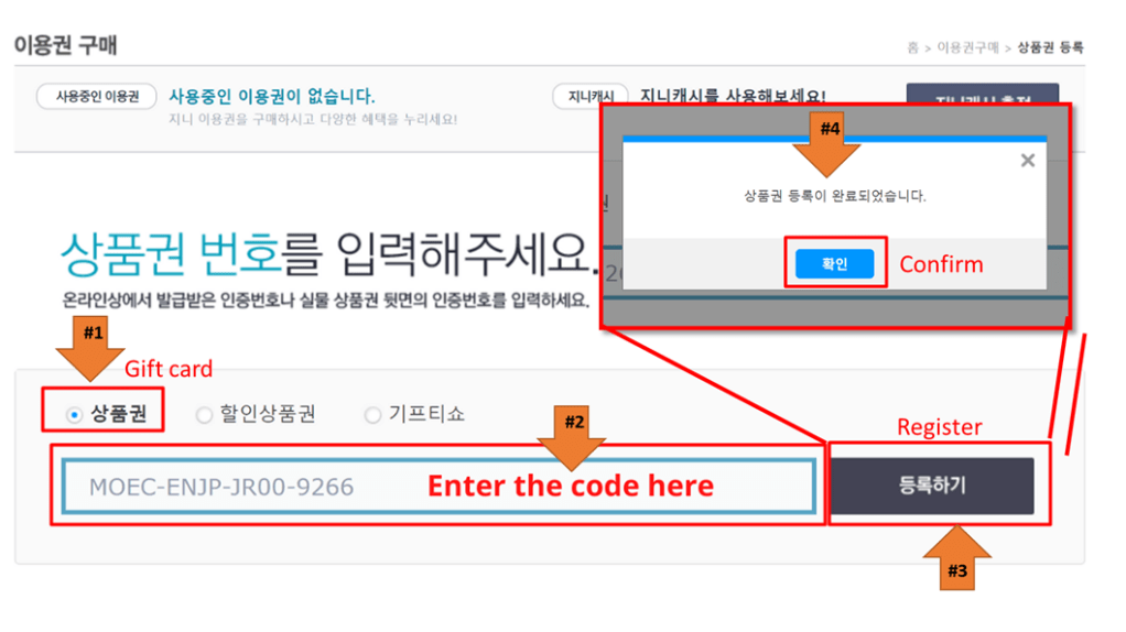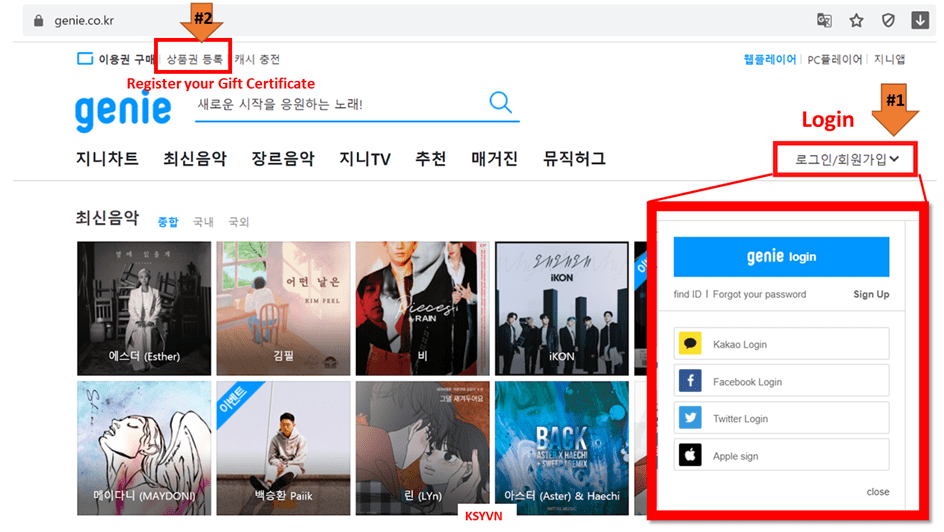 #1: Navigate to website: genie.co.kor & Sign in with your account. Click on ‘Register your Gift Certificate’