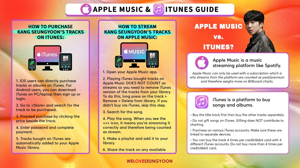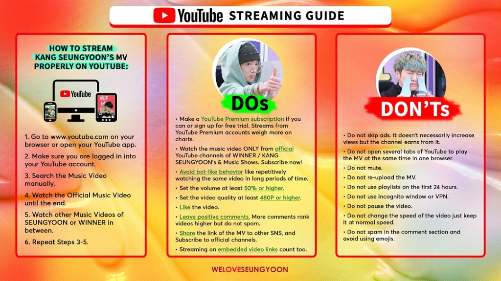 YouTube is the single most important streaming platform which is also free to use !! YouTube MV views are heavily counted in nearly all scoring systems from Korean Music Show win, Charts, Year-end awards & even international Billboard rankings. So make sure to listen to your favourite songs from Seungyoon on YouTube !