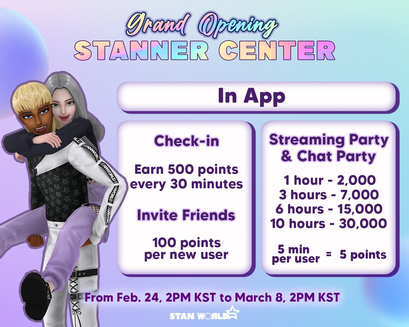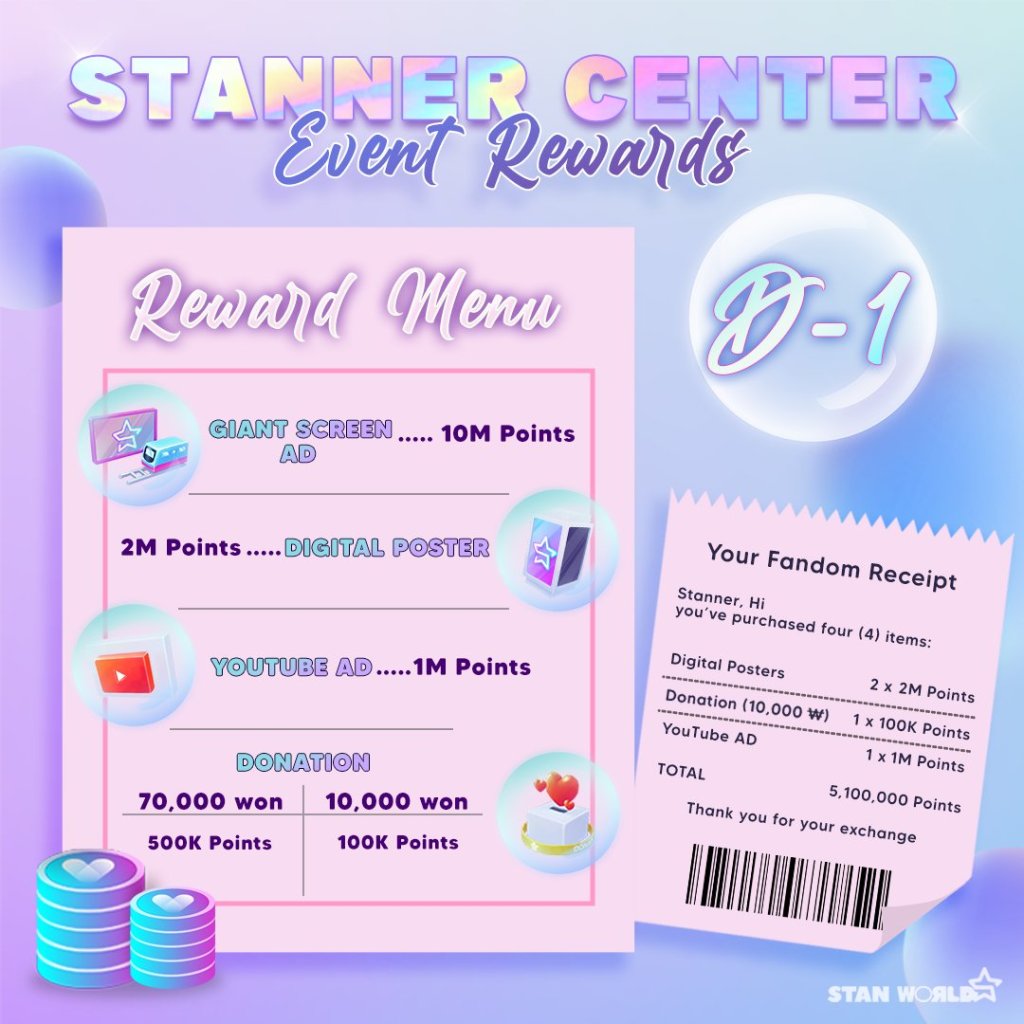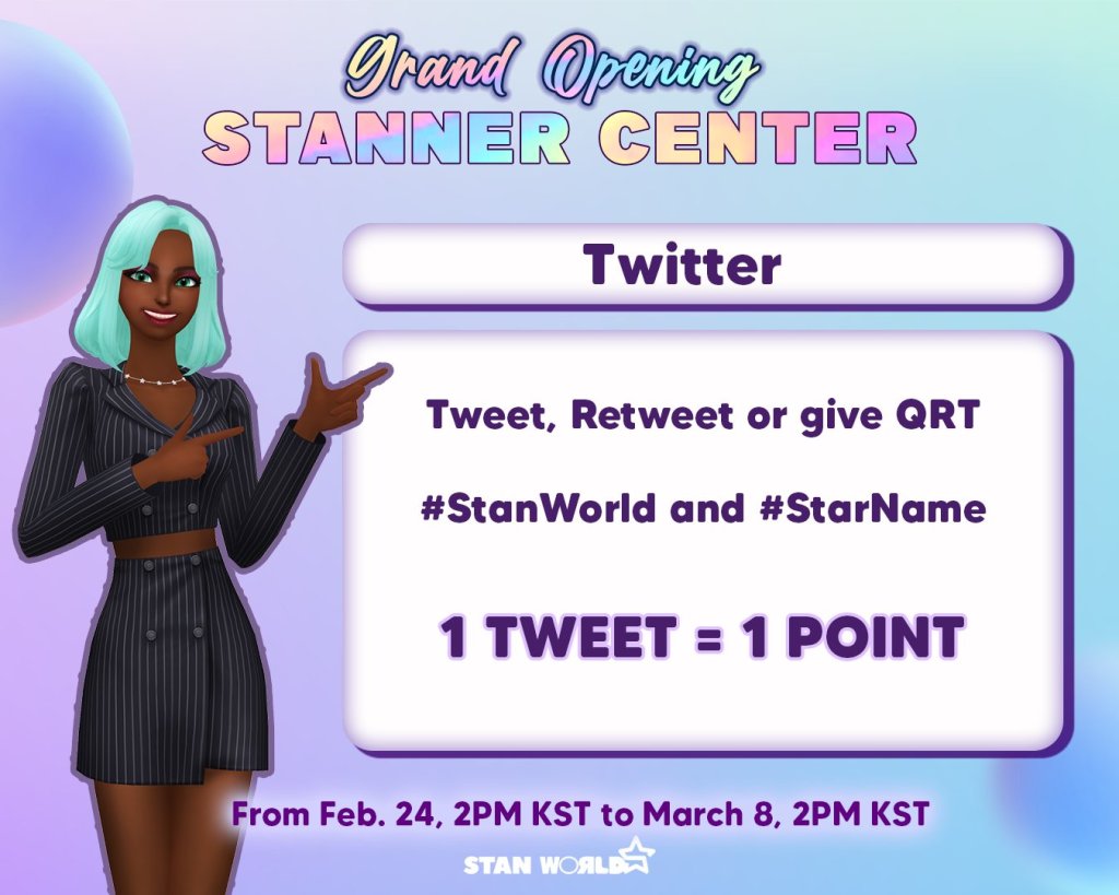 Stan World is a Fandom Party World (app) where fans can party & win rewards for their stars. Fans/users collect points to win ads (YouTube/digital/LED/subway) for their idols!