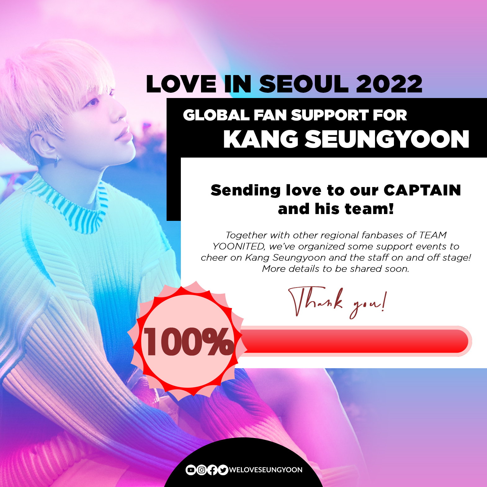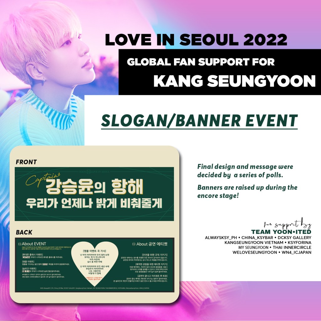 Regional KSY fanbases of TEAM YOONITED are back again with another global fan support project to cheer our CAPTAIN, Kang Seungyoon on his solo stage for LOVE IN SEOUL 2022 happening on November 6th!
