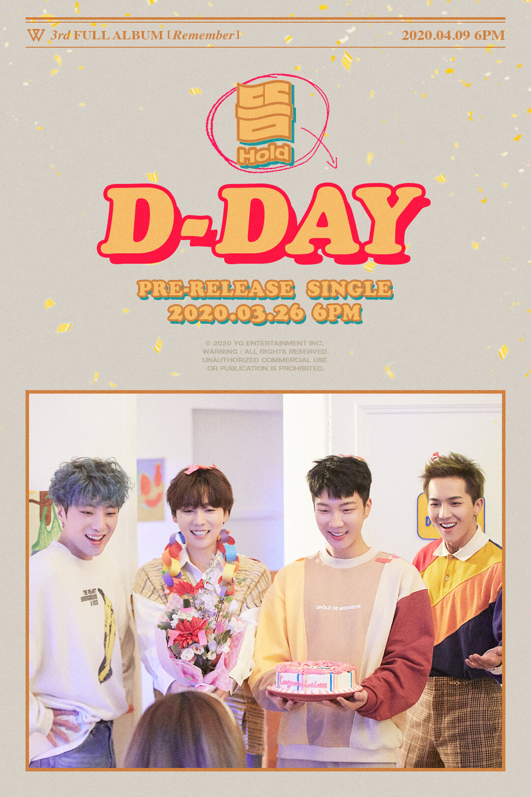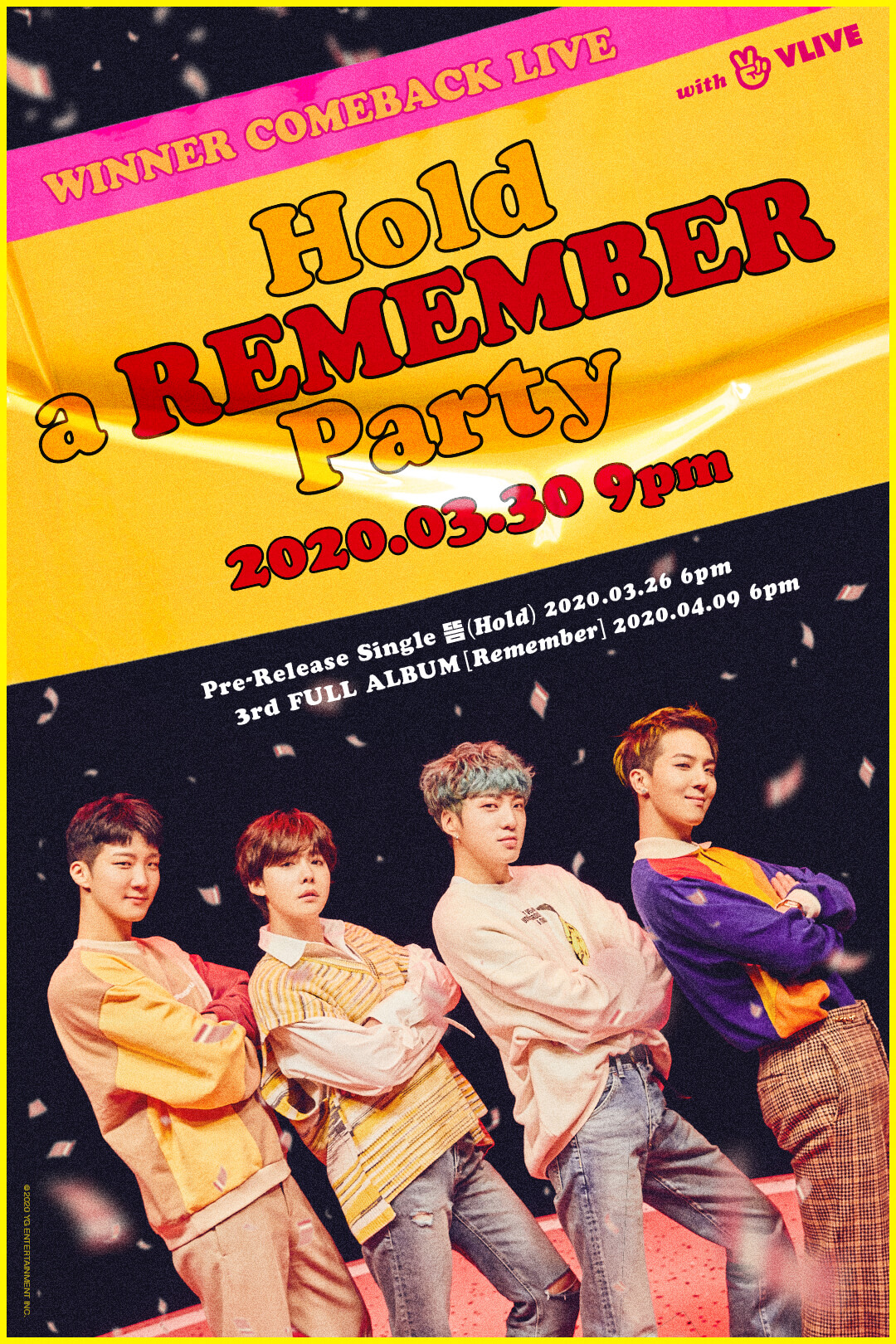 WINNER will perform ‘Hold’, the pre-release title song to be released on the 26th, through their ‘COMEBACK LIVE’ broadcast. On March 23 at 4 PM, YG Entertainment uploaded the ‘WINNER COMEBACK LIVE : Hold a ‘Remember’ Party’ poster through their official blog.